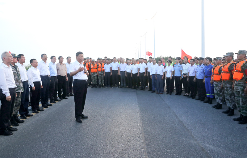 大堤上,習近平親切看望慰問了在防汛抗洪救災鬥爭中犧牲同誌的家屬、防汛抗洪一線人員、先進典型代表和參加抗洪搶險的部隊官兵,並向全國奮戰在防汛抗洪救災一線的同誌們表示誠摯的問候。他強調,今年入汛以來,南北方江河湖泊接連出現超警戒水位險情。廣大幹部群眾和人民解放軍、武警官兵堅決響應黨和政府號召,發揚不怕累苦、不怕疲勞、不怕犧牲的精神鬥誌,堅守在防汛抗洪救災第一線,湧現了許多先進典型和感人事跡,展現了中國人民眾誌成城、頑強拚搏、敢於勝利的英雄氣概,書寫了洪水無情人有情的人間大愛。黨和人民感謝你們!