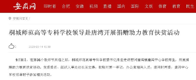 安徽網《桐城師範高等專科學校領導赴唐灣開展捐贈助力教育扶貧活動》