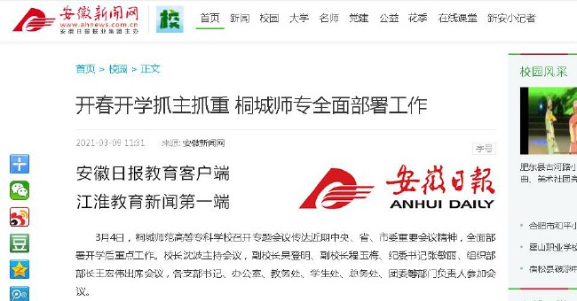 安徽新聞網《開春開學抓主抓重 桐城師專全麵部署工作》