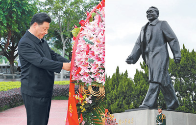 當天下午,習近平來到蓮花山公園,向鄧小平同誌銅像敬獻花籃。習近平緩步走上銅像基座,仔細整理花籃上的紅色緞帶,同大家一起向銅像三鞠躬,表達對鄧小平同誌的崇高敬意和深切緬懷。