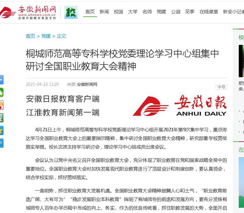 安徽新聞網:《桐城師範高等專科學校黨委理論學習中心組集中研討全國職業教育大會精神》