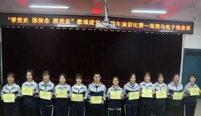 為隆重慶祝中國共產黨建黨100周年,重溫黨的光輝曆程,歌頌黨的偉大成就,繼承和發揚黨的優良傳統,引導學生牢記紅色曆史,根植紅色基因,充分展示當代大學生的愛黨愛國愛社會主義的深厚情懷,5月20日晚,商貿與電子信息係在以智樓報告廳舉辦“慶祝建黨100周年係列活動”——“學黨史、強信念、跟黨走”主題演講比賽決賽。評委由王煥庭老師、胡豔豔老師、李燕老師、葛晶晶老師和彭卉卉老師組成。