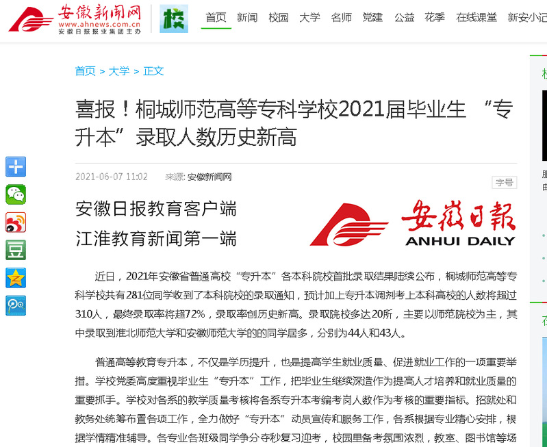 安徽新聞網:《喜報!桐城師範高等專科學校2021屆畢業生“專升本”錄取人數曆史新高》