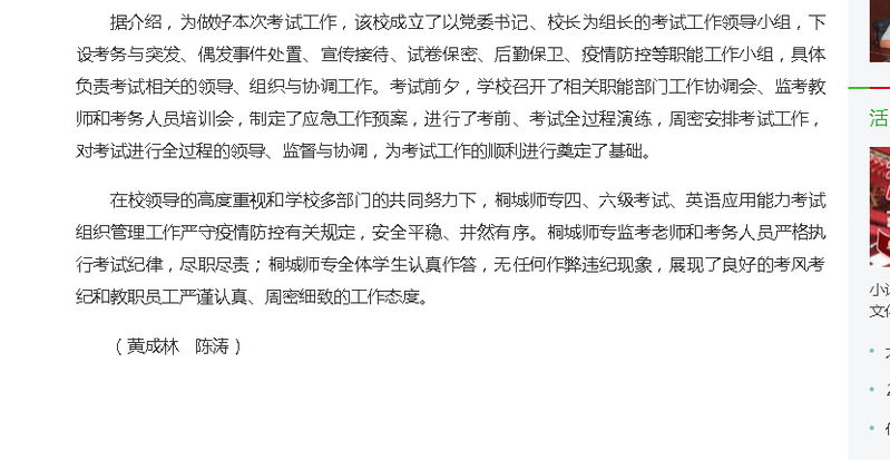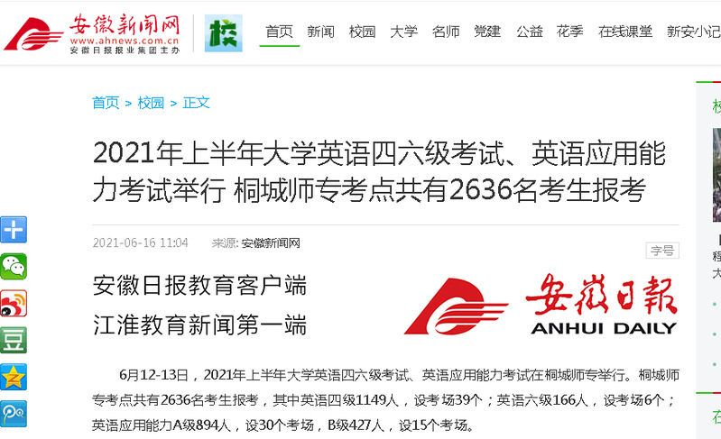 安徽新聞網:《2021年上半年大學英語四六級考試、英語應用能力考試舉行 桐城師專考點共有2636名考生報考》