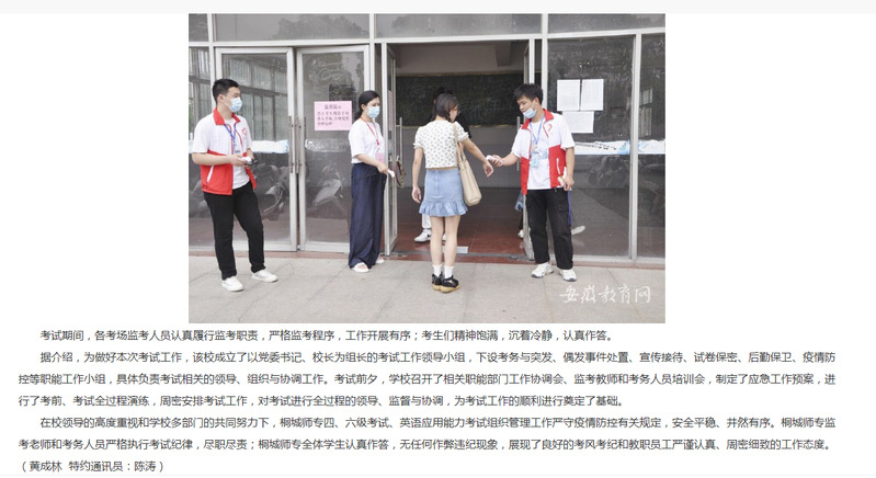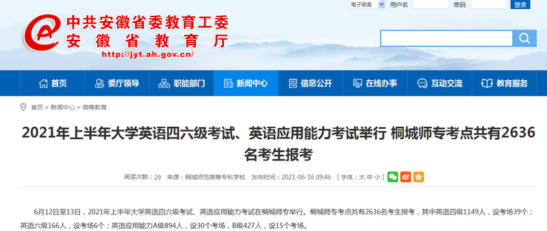 安徽教育網:《2021年上半年大學英語四六級考試、英語應用能力考試舉行 桐城師專考點共有2636名考生報考》