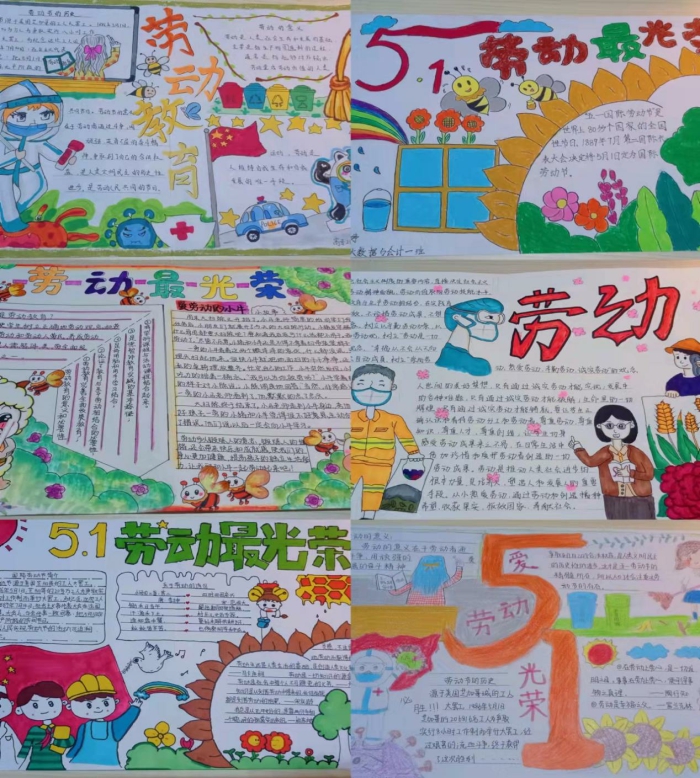 在“五一”這個禮讚勞動、致敬勞動者的日子裏,商貿與電子信息係開展手抄報五一專題征集活動,學生們動用雙手,手工繪畫關於勞動者的作品,致敬防疫、醫護人員、誌願者等勞動者,感受那份堅韌、溫暖與力量。通過手抄報展覽的方式,全麵做好勞動教育宣傳工作,培養學生動手能力,體驗勞動帶來的樂趣。