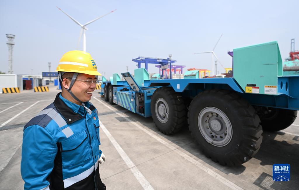 在天津港北疆港區C段智能化集裝箱碼頭,全國勞動模範成衛東參觀“水平運輸機器人”(4月29日攝)。新華社記者 李然 攝