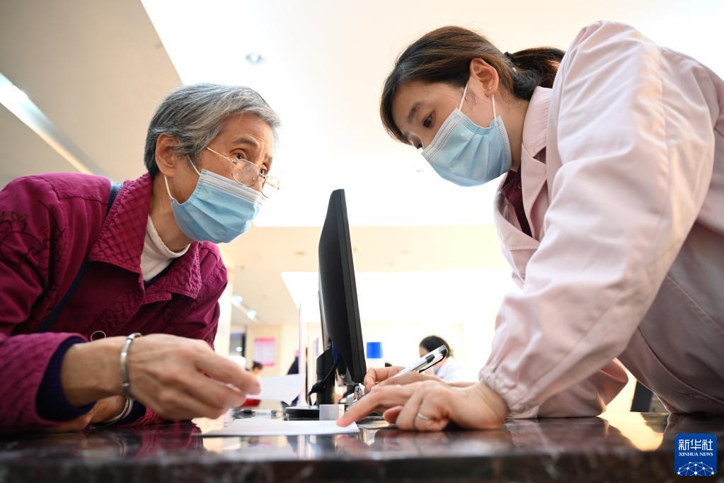 福建省三明市第一醫院醫保辦工作人員(右)向前來谘詢藥品報銷問題的居民講解相關政策(2020年11月18日攝)。新華社記者 薑克紅 攝