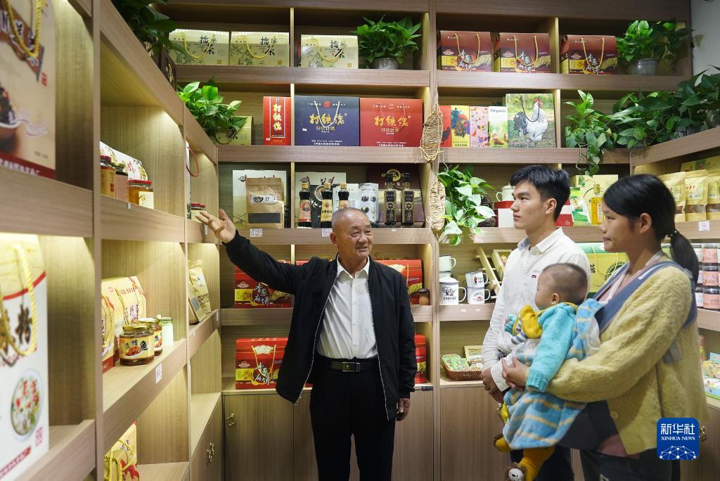 2020年10月21日,江西省贛州市於都縣梓山鎮潭頭村村民孫觀發(左一)向遊客介紹當地的特色農產品。 新華社記者 萬象 攝