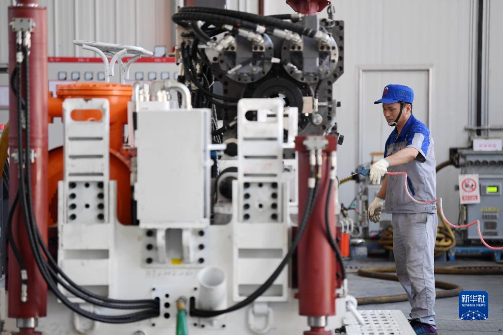 6月17日,在位於秦創原總窗口所在地陝西省西鹹新區的陝西太合智能鑽探有限公司,工人準備對智能定向鑽機進行性能調試。 新華社記者 李一博 攝