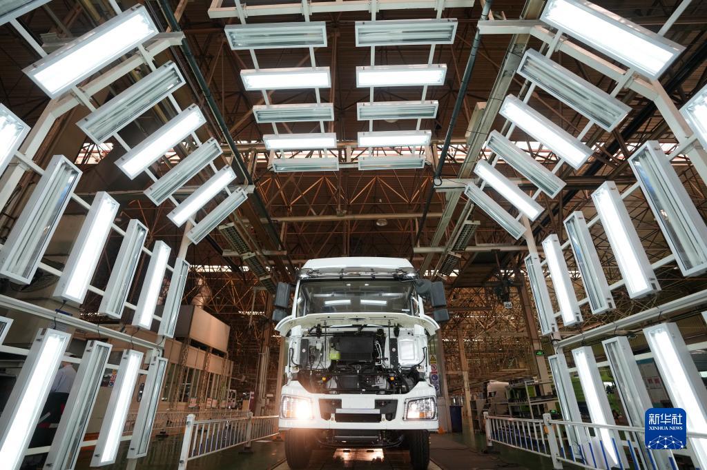 5月24日,在陝西汽車控股集團有限公司總裝車間,一輛裝配完畢的陝汽重型卡車等待驗收。 新華社記者 李一博 攝