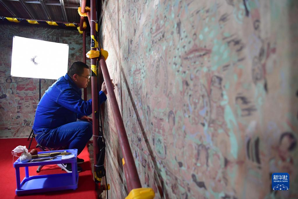 敦煌研究院文物保護技術服務中心壁畫修複師楊金禮在莫高窟第231窟內修複出現病害的壁畫(4月19日攝)。新華社記者 陳斌 攝