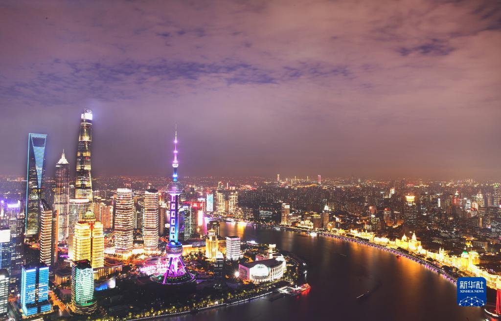 從上海白玉蘭廣場頂樓俯瞰浦東陸家嘴夜色(2020年10月18日攝,多重曝光圖)。新華社記者 方喆 攝