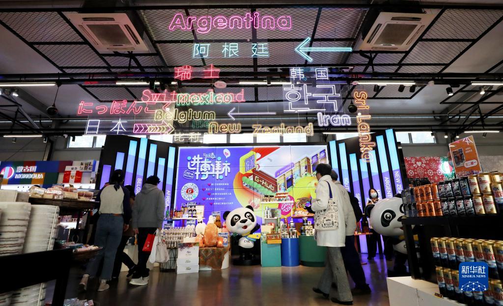 在上海市南京路上的進博集市內,顧客們走在一處各國商品集中展示台前(2021年11月8日攝)。新華社記者 方喆 攝