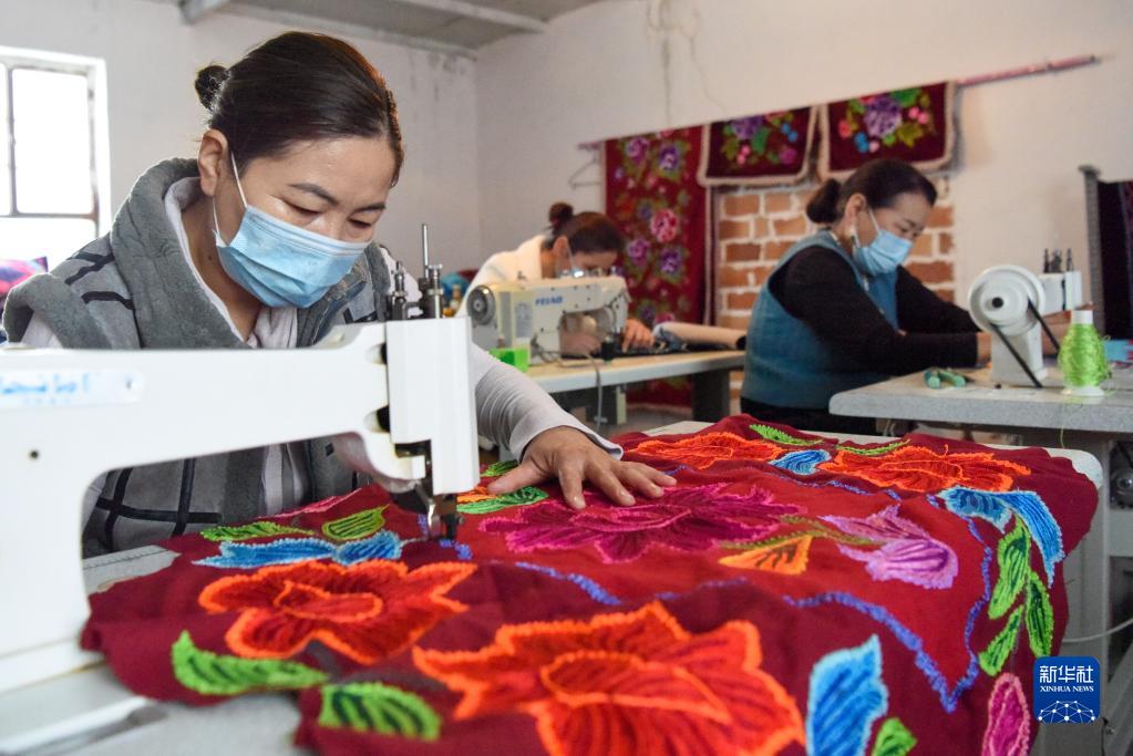在新疆吉木薩爾縣白泉村刺繡專業合作社,繡娘在製作哈薩克族刺繡(2021年1月23日攝)。新華社記者 丁磊 攝