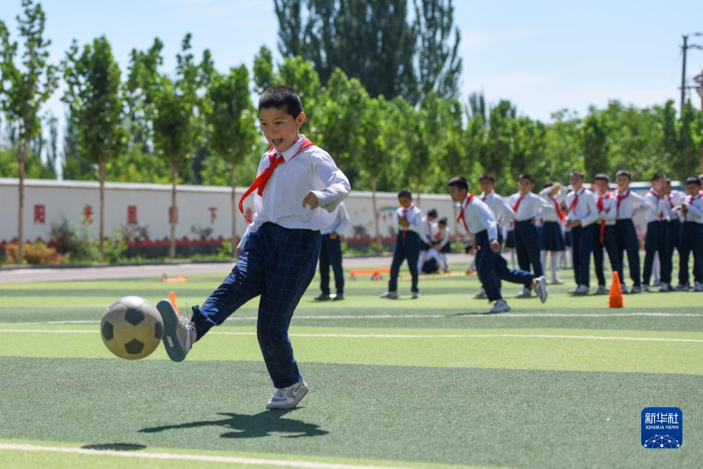 在新疆喀什地區疏附縣托克紮克鎮中心小學,學生們在上體育課(2022年6月10日攝)。新華社記者 丁磊 攝