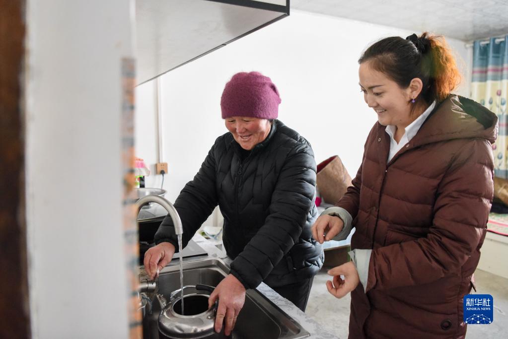 在新疆福海縣解特阿熱勒鎮京什開薩爾村,村幹部(右)來到前不久剛接通自來水的村民家中了解水質情況(2021年11月25日攝)。新華社記者 丁磊 攝