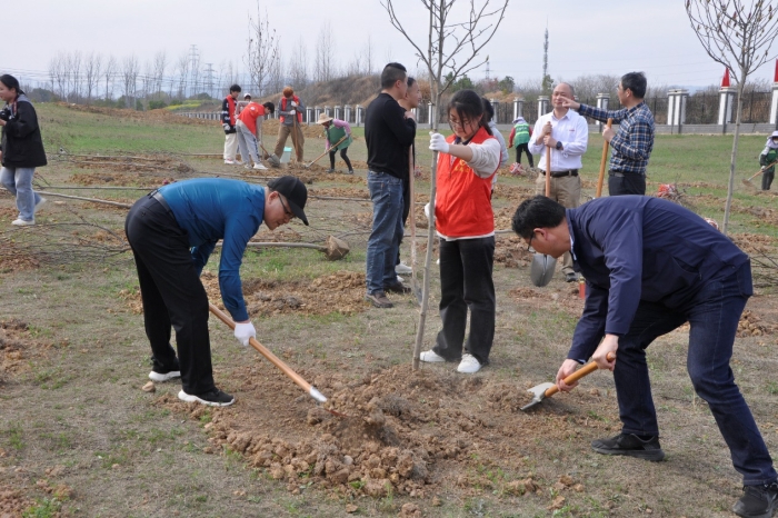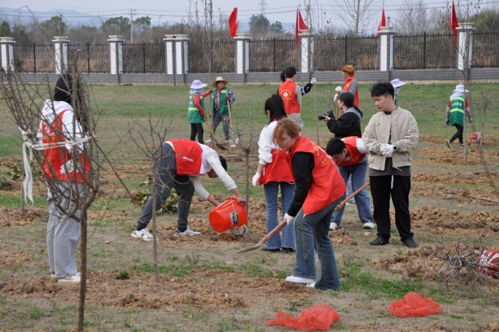 植樹現場,在校領導的帶領下,老師和同學們三五成組、揮鍬鏟土、踏土夯苗、提水澆灌,熟練認真地完成著每一道工序,不一會兒便為新校區靠北麵圍牆區域新添了不少“新丁”。大家將一棵棵滿載希望的樹苗種植下去,在和煦的春風中,樹苗錯落有致、亭亭玉立,為春日的校園增添了一抹新綠,盡顯盎然生機。