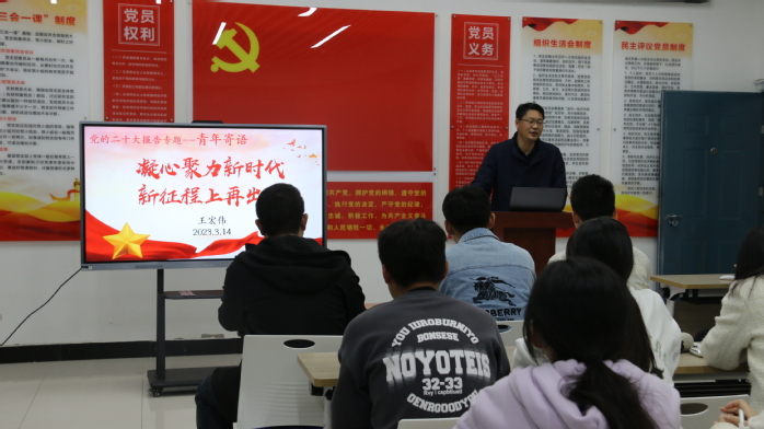 3月14日下午,校黨委委員、組織統戰部長王宏偉深入小教係2019級全科教育1、2班級課堂為學生上了一節思政課;晚自習期間,王宏偉又深入商電係“一站式”學生社區做了一場題為《凝心聚力新時代、新征程上再出發》的講座,同學生麵對麵座談、交流黨的二十大精神。