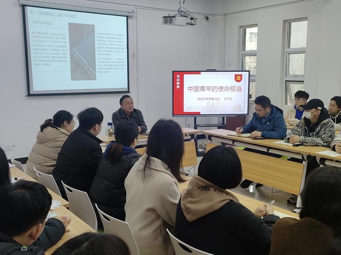王子龍圍繞“新時代中國青年的使命職責”這一主線,指出黨對青年寄予厚望,作為新時代大學生,要牢記習近平總書記的囑托,勇於擔當時代賦予的曆史責任,勇於拚搏奮鬥,肩負起中國青年必須肩負的曆史使命,讓青春在全麵建設社會主義現代化國家的火熱實踐中綻放絢麗之花。希望青年學生們能夠做到立誌有為、勇於擔當,不負偉大新時代。第一要堅定理想信念,堅定“四個自信”;第二要增強“四個意識”,做到“兩個維護”;第三要努力學習實踐,練就過硬本領;第四要勇於砥礪奮鬥,投身強國偉業。