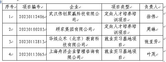 4月6日,教育部高校學生司公布《關於公布第二期供需對接就業育人項目立項名單的通知》,我校與武漢偉創聚贏科技有限公司、顧家集團有限公司、華娛眾禾(北京)教育科技有限公司、上海舟濟企業管理谘詢有限公司等用人單位合作的4個項目獲批立項,合作領域涵蓋教育、農林、文旅藝術3個行業。