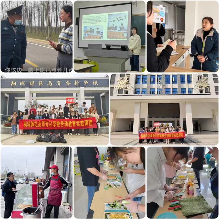 勞動教育課程組積極探索勞動教育課程實踐形式,依據勞動教育育人屬性,逐步探索勞動育人新道路,將勞動教育開在課堂、開在校園、開在社會。通過開展勞動教育係列活動,幫助學生認識勞動、了解勞動精神、致敬勞模精神和工匠精神。開展采訪身邊的勞動者活動,向宿管阿姨、食堂阿姨、保安大叔致敬,體驗他們的工作日常,感悟勞動意義;開展“致敬勞動”攝影活動,讓學生在大街小巷、田間地頭尋找“勞動美”;開展“從博物館裏看勞動”活動,讓學生感受勞動是推動人類社會進步的根本力量;開展“維護勞動權益——大學生模擬法庭”活動,讓學生增強法治意識、法治思維,維護自身權益;開展踏春尋美行動,帶領學生去西郊公園、快樂廣場,美化身邊的環境;開展專業勞動實踐創業活動,促進學生創新創業思維等等。