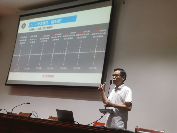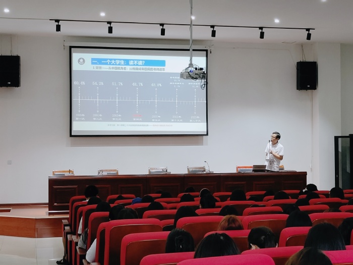 9月20日,“惜抱讀書會”、“書香旅管”讀書沙龍迎來了新學期第一場讀書講座,安徽農業大學圖書館、檔案館研究館員、碩士生導師吳文革為我校師生作《“讀不讀”“讀什麽”“怎麽讀”——大學生必做的三道考題》專題講座。本次活動由校圖文信息中心黨支部和旅遊與公共管理係共同主辦,校圖書館、上海新華傳媒連鎖有限公司承辦。圖文信息中心黨支部、旅管係師生200多人現場聆聽講座。