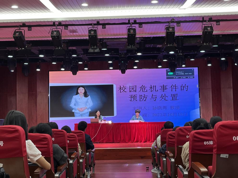 講座伊始,孫曉青教授緊扣熱點,從國內外社會安全形勢出發,引入當下校園安全現狀,強調了校園安全管理與教育的重要性以及掌握科學高效應對理念與方法的必要性。講座中,孫教授從近幾年出現的校園危機案例入手,分析了校園危機幹預工作的現狀,強調危機識別是危機預防和幹預的最重要環節之一。孫教授重點圍繞校園危機信號的識別、危機預警與幹預原則及基本要素等切入點深度解析如何預防並妥善處理危機事件,充分利用個案實例、權威研究數據以及先進工作經驗就如何應對校園危機事件作了專業的講解。