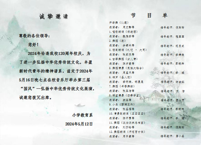 為了更好地學習和踐行習近平文化思想,高舉中國特色社會主義偉大旗幟,培育和踐行社會主義核心價值觀,弘揚中華民族優秀傳統文化。值此我校120周年校慶之際,5月16日晚在校音樂廳,學校隆重舉辦了以“弦歌不輟百廿載,立德樹人續華章”為主題的校園文化係列活動之第三屆“國風”——弘揚中華優秀傳統文化展演活動。校黨委書記王子龍,黨委副書記、紀委書記張敏麗,副校長程玉梅,黨委委員、宣傳部長伍建強與200多名師生共同觀看了展演。