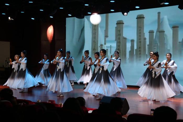 一首《將進酒》的唱歌朗誦,讓觀眾穿越了時間和空間,感受千年前詩人筆下噴湧而出跌宕起伏的情感,和振聾發聵的氣勢與豪邁。體會著經典詩詞之所以能夠流傳至今,不僅隻是詩詞和文字本身的傳承,更是其浸潤的深厚文化精神內核的傳承和發揚。舞蹈《驍》,讓人領略了中華文化博大精深,芳華萬卷,文化自信一覽無餘。以話劇和朗誦形式展現的《禮記·大同》,讓在場的觀眾無不慨歎何謂“文明之邦、禮儀之邦”,以及感動於中華民族自古以來對和諧大同社會的那份向往、追求與執著。古箏舞蹈《女兒情》,更是以跳躍的指尖,優美的舞姿演繹出了新時代桐城師專女孩兒們的純情、美好、努力和才情。舞蹈情景劇《民族大融合》通過傣族、維吾爾族、藏族等各具民族特色的舞蹈,生動形象地再現了中華民族56個民族一家親,像石榴籽一樣緊緊抱在一起,給觀眾帶來民族大融合的那份和諧融洽、團結美好的藝術熏陶。《聖人說》的相聲表演,以現代相聲的表演形式演繹了古時聖人風采,讓人感受我校學子俏皮活潑的才情展演和青春活力。《書香舞韻》,演員們以身為筆,舞出了人生精彩一筆,傳達了書香舞韻少年誌,傳承躬行中華情。“欲把西湖比西子,淡妝濃抹總相宜”,舞蹈《淡妝濃抹總相宜》仿佛在向觀眾無言傾訴,“清水出芙蓉,天然去雕飾”,自然之美,無需刻意雕琢,淡妝時,如同深藏心底的柔情;濃抹時,如同展演的灼灼其華。