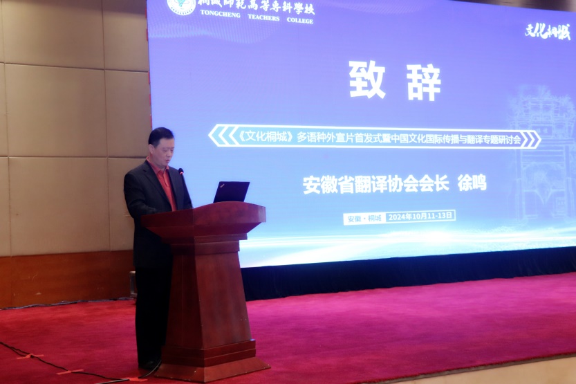 安徽省翻譯協會會長徐鳴致辭。他代表協會向桐城師範高等專科學校辦學120周年表示祝賀,並強調了翻譯在國際傳播中的關鍵作用。徐會長提到,隨著人工智能技術的發展,翻譯實踐與技術應用的融合將成為時代大勢。他呼籲加強翻譯人才隊伍建設,培養具有跨文化交際能力和現代翻譯技術掌握的複合型人才。