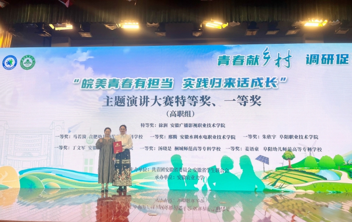 10月20日-21日,由安徽省教育廳、共青團安徽省委、安徽省演講協會聯合舉辦的“皖美青春有擔當,實踐歸來話成長”第七屆安徽省主題演講比賽在安徽農業大學成功舉辦。我校小學教育係湯曉是同學在全省三十多所高職高專一百多名選手中脫穎而出,摘得一等獎第一名的桂冠!