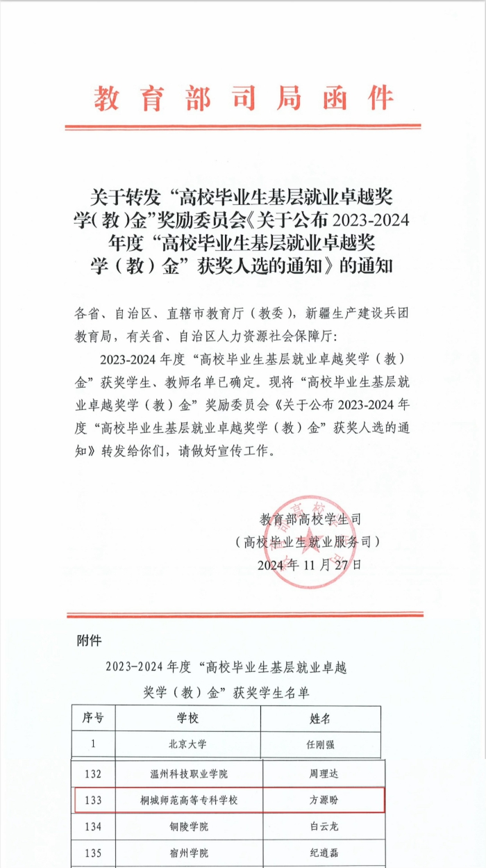 近日,教育部公布2023—2024年度“高校畢業生基層就業卓越獎學(教)金”獲獎名單,我校2014屆畢業生方源盼獲評“全國高校畢業生基層就業卓越獎學金”。