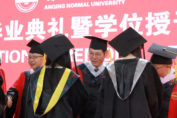伴隨著雄壯莊嚴的國歌聲,畢業典禮拉開帷幕。江貴生校長同安慶師範大學黨政領導一起為碩士畢業生代表、本科畢業生代表撥穗並授予學位證書,為專科畢業生代表頒發畢業證書,同時為畢業班校友聯絡員代表頒發聘書。這一莊重儀式標誌著我校與安慶師大合作辦學模式下培養的本科生圓滿完成學業。