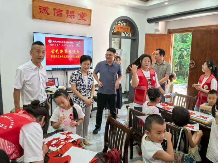7月30日上午,校黨委副書記張敏麗帶隊前往桐城市嬉子湖鎮裁襟勵子文化園,看望慰問在此開展暑期“三下鄉”社會實踐的“古藝新芽植沃土——剪紙、琺琅非遺技藝的青春傳承與鄉土賦能”團隊師生,並與大家親切座談,深入了解實踐進展,給予關懷與鼓勵。藝術與設計係主任周琳、校團委書記汪若冰、團委副書記、小學教育係黨總支副書記胡二慶和藝術係黨總支副書記倪甜甜陪同。嬉子湖鎮黨委組織委員吳群熱情接待了一行人。說明:15e881be0e47b08480e939053c568a91