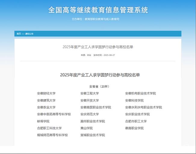 近日,教育部公布了2025年度產業工人求學圓夢行動參與高校名單,全國共遴選289家高校,安徽省共20所本專科院校成功入選,我校申報的桐城國軒新能源技術有限公司產業工人學曆繼續教育項目成功入選教育部2025年度產業工人求學圓夢行動參與高校名單,成為助力產業工人學曆與能力提升的重要力量,也體現了我校在國家政策引領下,推進產業工人隊伍建設的強擔當和硬實力。