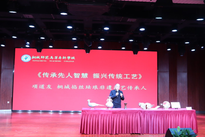 桐城文化展示環節由馬克思主義學院院長雷小麗主持。桐城師專學生生動展示了與桐城文化相關的實踐成果,體現了青年一代對地方文化與倫理知識的深入探索。桐城掐絲琺琅非遺傳承人項道友先生作《傳承先人智慧 振興傳統工藝》專題報告,結合自身傳承實踐,講述了非遺技藝中蘊含的倫理內涵與時代價值,展現了傳統文化與倫理精神的有機融合。