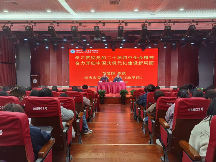 為深入學習貫徹黨的二十屆四中全會精神,12月2日,學校特邀安慶市委黨校(安慶行政學院)胡建國教授來校作專題輔導報告。學校中層幹部、學前教育係全體教職工及學生代表參會,學校黨委委員、宣傳部部長、辦公室主任伍建強主持報告會。