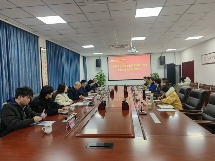 為深化校地合作、校企合作,搭建文旅產業人才供需對接橋梁,12月12日下午,懷寧縣委常委、宣傳部部長施躍平帶隊來我校開展文旅產業招才引智專項活動,浙江新長城文旅集團有限公司總裁程海波,安慶矽基思索科技有限公司相關負責人、懷寧縣文化旅遊體育局和人力資源和社會保障局有關領導隨行。副校長程玉梅出席會議。