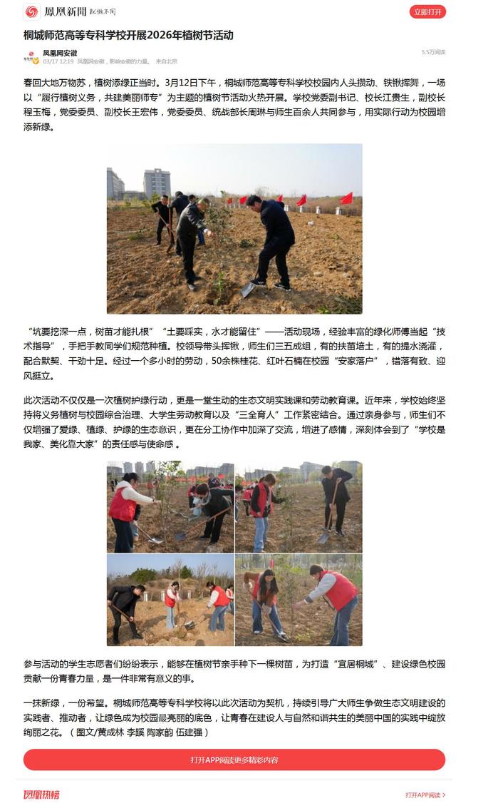 鳳凰新聞:桐城師範高等專科學校開展2026年植樹節活動