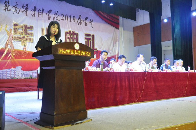 學前教育係初專14級3班吳苗苗、小學教育係高專17級文2班韓露作為畢業生代表和在校生代表先後發言。旅遊與公共管理係魏可作為教師代表發言。