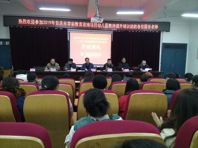 12月1日,2019年安慶市學前教育雙培項目——幼兒園教師提升培訓項目開班儀式在桐城師專以智樓一樓報告廳順利舉行。桐城師專校長沈波、安慶市教體局副局長周泉、安慶市教體局基教科科長方敏、桐城師專總務處處長童日進、桐城市教育局學前教育管理委員會主任張有勝出席開班儀式。全體參訓學員、桐城師專項目執行組成員和桐城師專學前教育係“行知班”學生參加。開班儀式由桐城師專教務處處長黃洪沫主持。