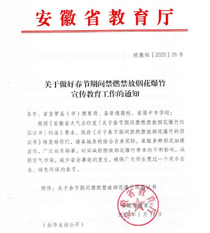 轉發《關於做好春節期間禁燃禁放煙花爆竹宣傳教育工作的通知》
