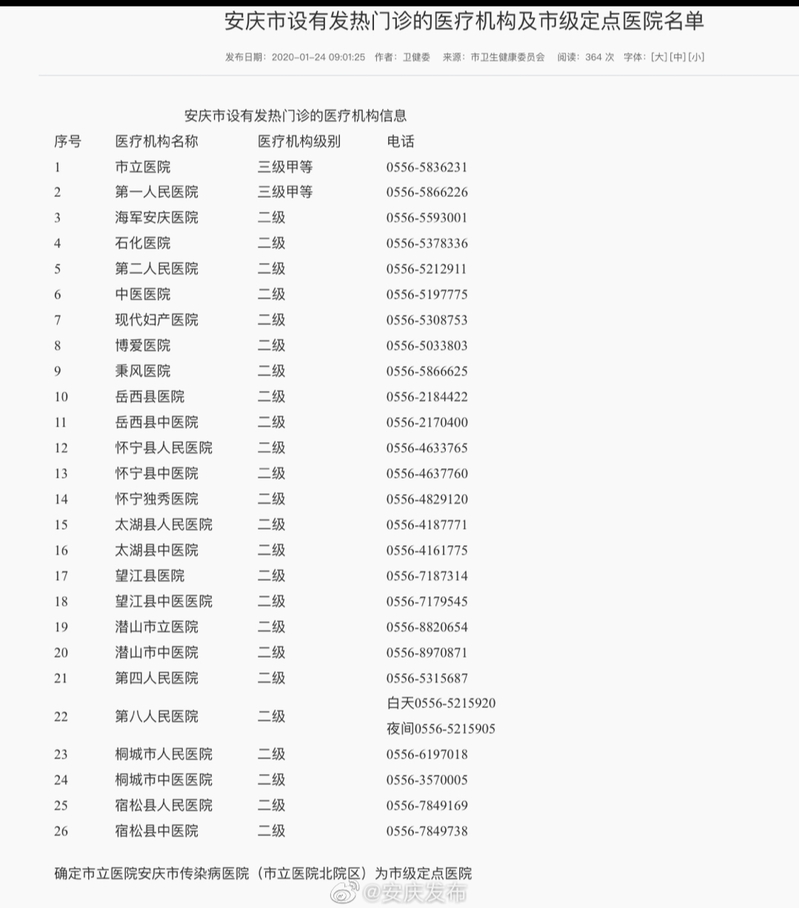 安慶市設有發熱門診的醫療機構及市級定點醫院名單
