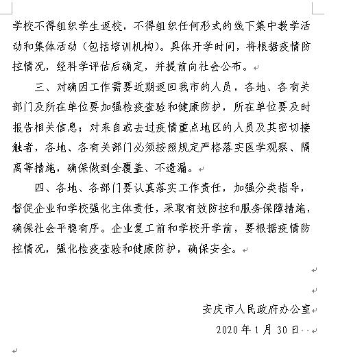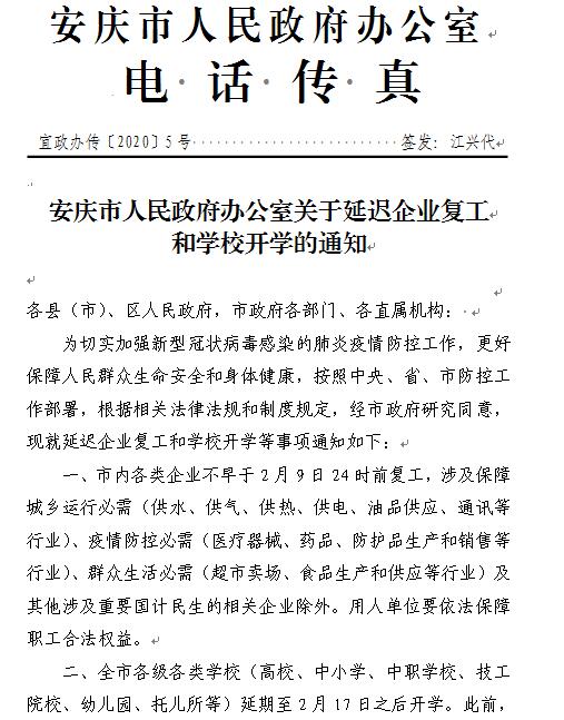 安慶市人民政府辦公室關於延遲企業複工和學校開學的通知