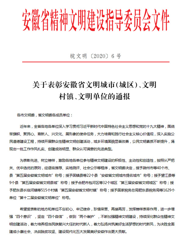 6月9日,安徽省精神文明建設指導委員會發布《關於表彰安徽省文明城市(城區)、文明村鎮、文明單位的通報》(皖文明〔2020〕6號),桐城師範高等專科學校再度榜上有名,榮獲“第十二屆安徽省文明單位”榮譽稱號。