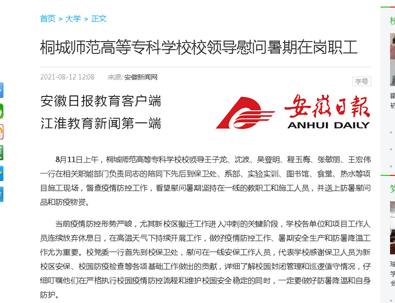 安徽新聞網:《桐城師範高等專科學校校領導慰問暑期在崗職工》