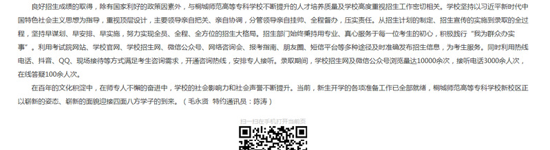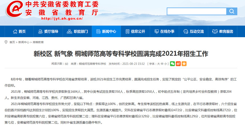 安徽教育網:《新校區 新氣象 桐城師範高等專科學校圓滿完成2021年招生工作》