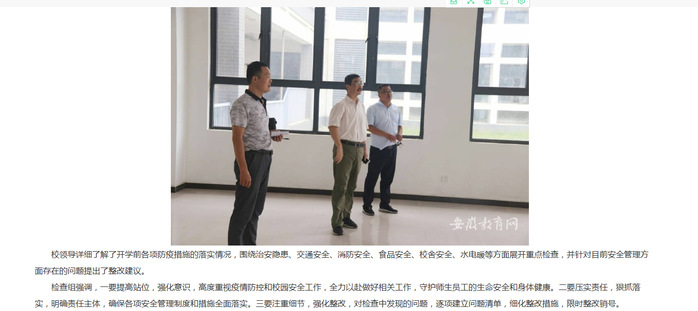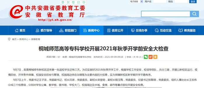 安徽教育網:《桐城師範高等專科學校開展2021年秋季開學前安全大檢查》