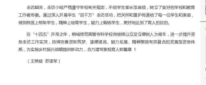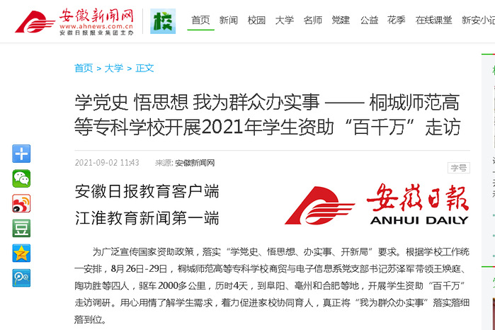 安徽新聞網:《學黨史 悟思想 我為群眾辦實事——桐城師範高等專科學校開展2021年學生資助“百千萬”走訪》